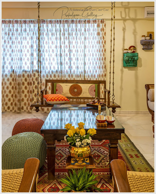 As one can see, there are a lot of beautiful textures at play. The details of the oonjal can be better appreciated from this close up shot. Veshali excitedly adds, "The Oonjal has become synonmous with the gallery. It has been such a pleasure to see more and more homes in Singapore, incorporating the Oonjal. I am trying my best to avoid duplication of the designs and find myself experimenting to keep things fresh. This oonjal too was designed by yours truly to reuse a vintage panel as the back rest. I love how it has resulted in a contemporary feel to an ethnic piece." We couldn't agree more on how skillfully Veshali has elevated the look of the basic furniture piece with the beautiful details.