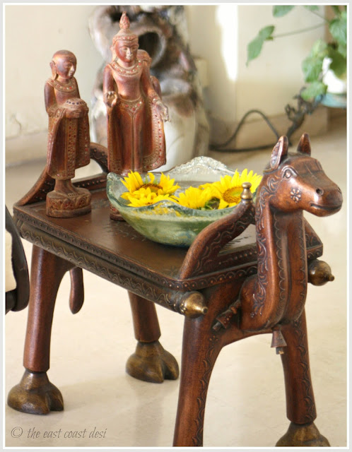 Antique dancing Buddha is another find from Siem Reap, Cambodia. More floating sunflowers in a copper urli from Coppre. Here's what Hemangini had to say about influences on her design style, "My Mom has always inspired me to keep a beautiful home. She did a marvelous job at a time when decor stores in India were non-existent. I have always been interested in home decor and would devour all the fabulous decor books in the library right since my college days!"